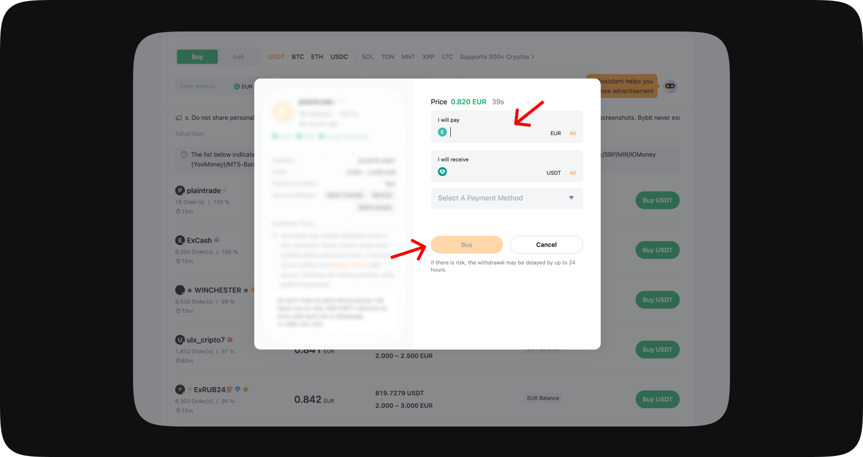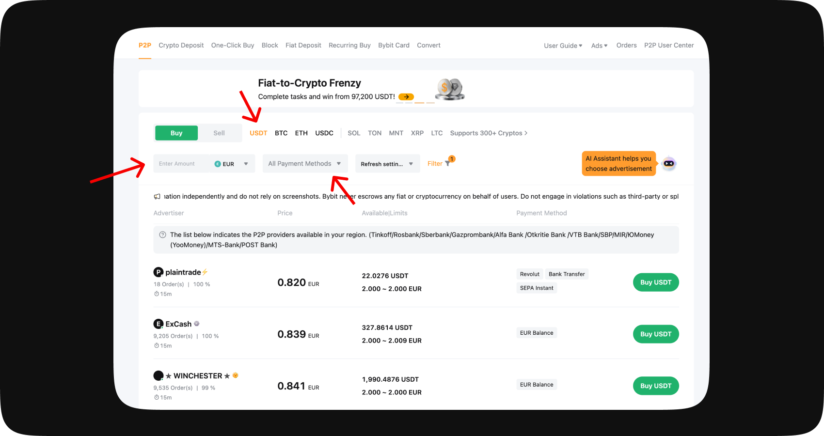 Option A. Buy USDT via a P2P Platform (for example, Bybit)