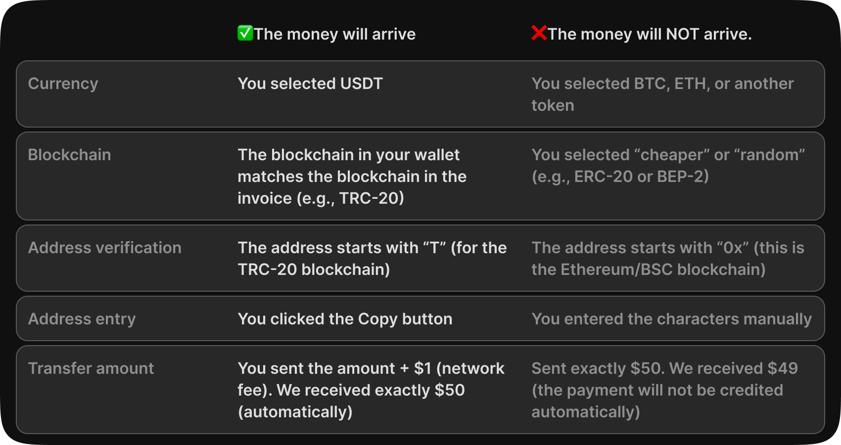 A common mistake is choosing BTC (Bitcoin) instead of USDT. These are different currencies, and the payment will not go through.